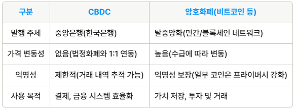 CBDC는 중앙은행이 발행하는 디지털 화폐로, 법정화폐(원화)와 동일한 가치를 가지며 디지털 형태로 유통됩니다.